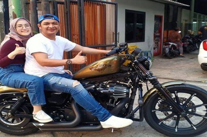 Pasha tampak membonceng sang istri dengan motor barunya.
