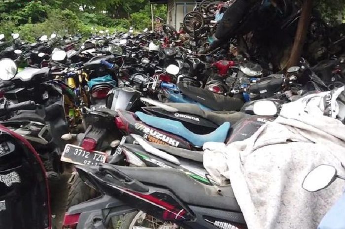 Ratusan motor berbagai merek teronggok di sebuah lahan kosong, kehujanan dan kepanasan tanpa pemilik.