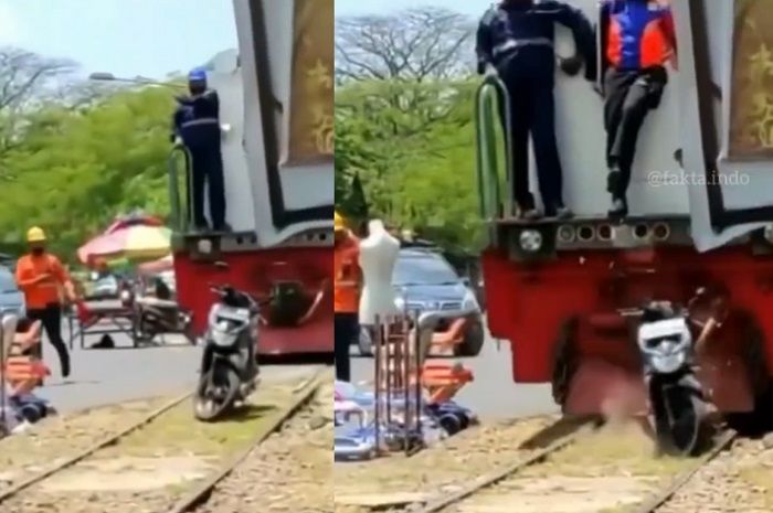 Motor Honda BeAT langsung ditabrak kereta api dari belakang.