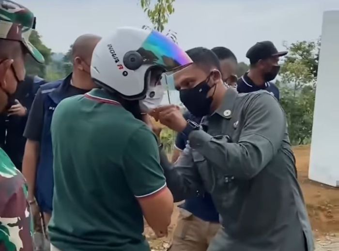 Setelah sampai dilokasi Sandiaga juga kesulitan melepas helmnya sampai minta dibantu untuk melepaskannya.