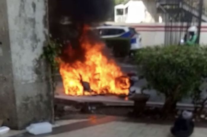 Gridmotor.id - Tragis, motor driver ojol mendadak terbakar sampai hangus, pakaian penumpang ikut tersambar api.
