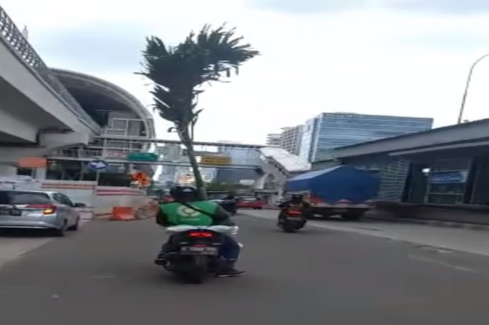 Karena bentuk pohonnya yang tinggi, driver ojol itu memacu motornya sangat pelan.