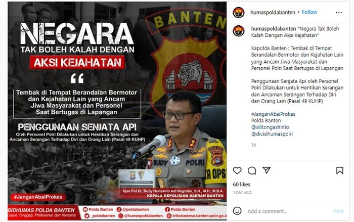 Dikutip dari akun Instagram @humaspoldabanten, Kapolda Banten, Irjen Pol. Dr. Rudy Heriyanto Adi Nugroho, SH, MH, MBA, memerintahkan agar tembak di tempat untuk berandalan bermotor dan kejahatan lain.