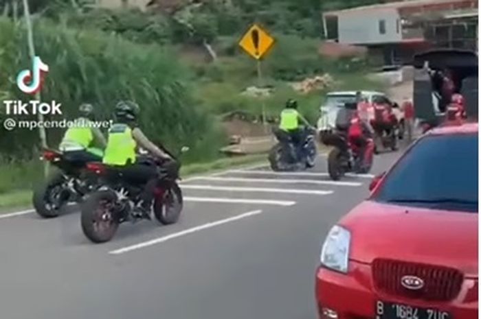 Dalam video terlihat rombongan polisi memakai motor sport.