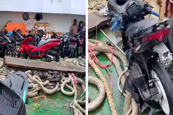 Gridmotor.id - Sebuah video memperlihatkan beberapa motor ringsek saat berada di dalam kapal penyebrangan.