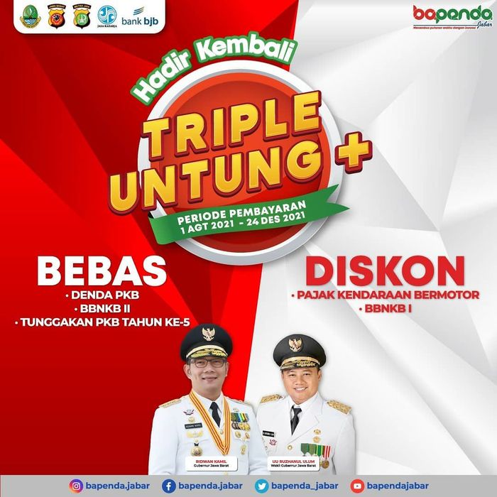 Seperti Bebas Denda Pajak Kendaraan Bermotor, Bebas Bea Balik Nama II, Diskon Pajak Kendaraan Bermotor dan Diskon Bea Balik Nama Kendaraan Bermotor (BBNKB) I.