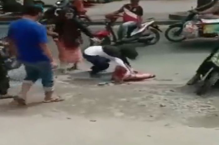 Ibu-ibu tersebut langsung memukul perempuan yang diboncengi pria tersebut hingga jatuh dari motor.