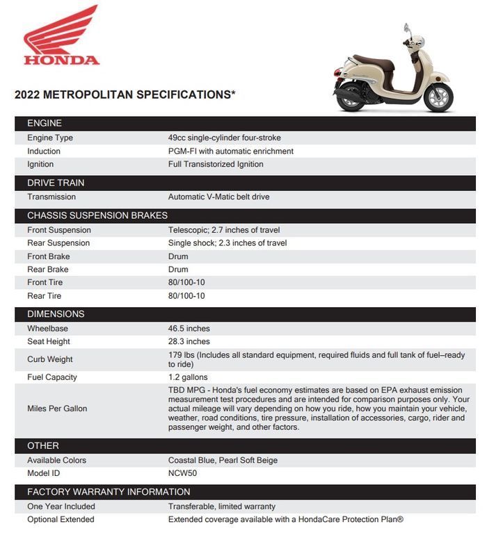 Honda mengklaim Metropolitan mampu melahap jarak sejauh 49,74 Km dengan 1 liter bensin.