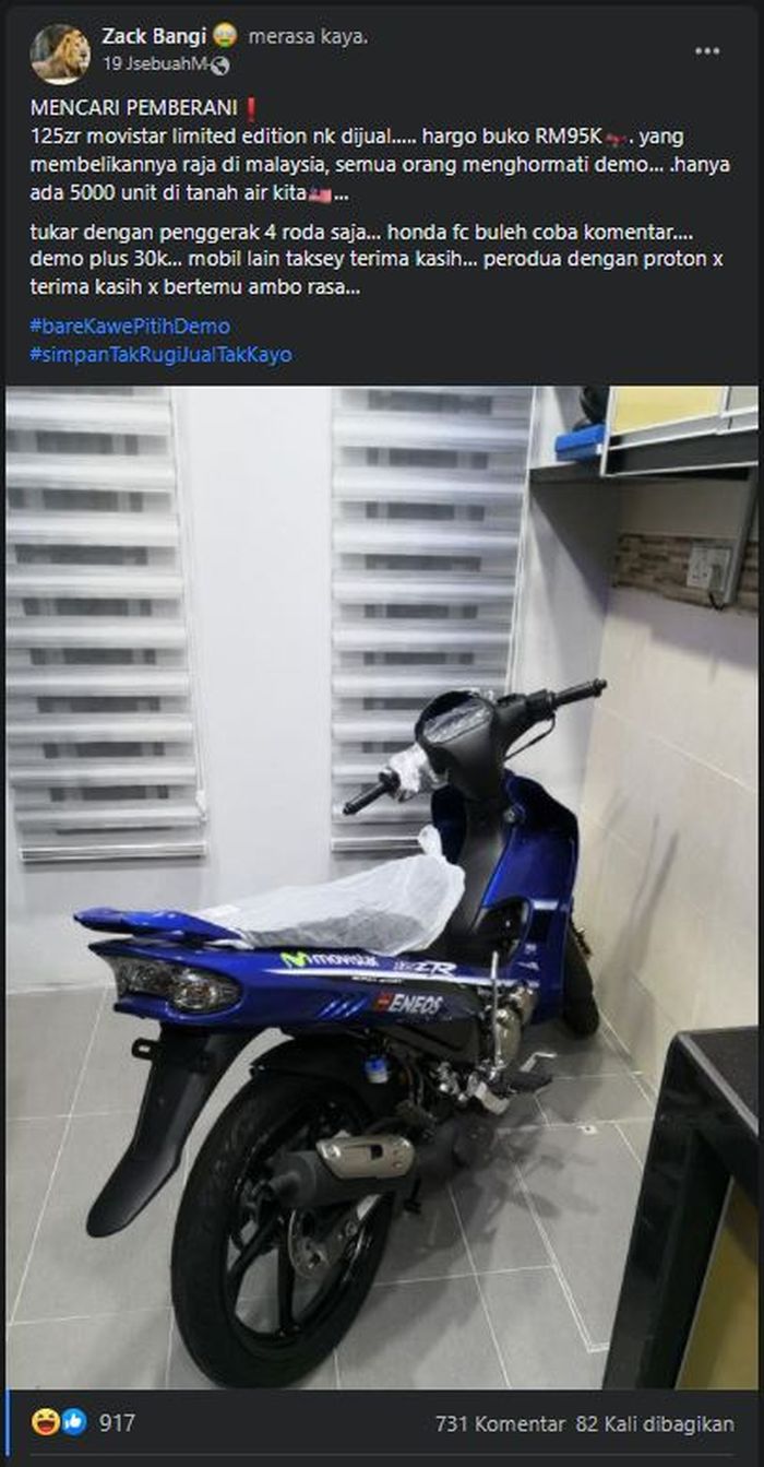 Unggahan tersebut ia posting di sebuah grup Facebook Yamaha 125ZR dan RXZ Malaysia.