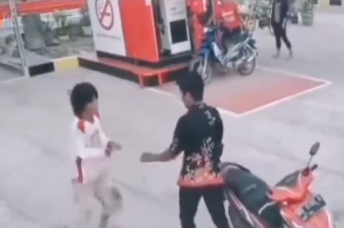 Saat akan melaju, datang pria berambut panjang dan berkaos putih menghampiri pemotor itu.
