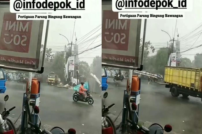 Gridmotor.id - Sebuah video memperlihatkan detik-detik pemotor nyaris tertimpa baliho akibat hujang angin di Depok.