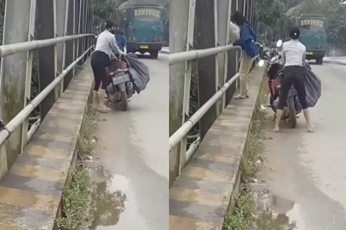 Dalam video tersebut terlihat 2 wanita berboncengan menaiki motor Honda Vario berhenti di sebuah jembatan.