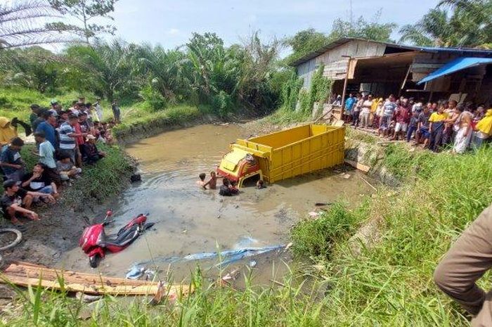 Gridmotor.id - Seorang bocah nekat mengemudkikan truk, menabrak dua pemotor hingga masuk sungai.