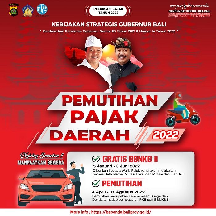 Ada dua keringanan yang diberikan Pemprov Bali, yaitu menggratiskan Bea Balik Nama Kendaraan Bermotor kedua atau BBNKB kedua, serta program pemutihan pajak.