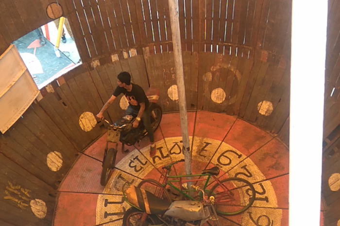 GridMotor.id - Atraksi tong setan adalah pertunjukan atraksi sepeda motor yang dikendarai sepanjang tembok vertikal yang terbuat dari kayu berbentuk tabung atau kerucut.