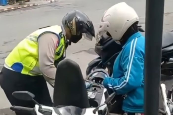 Melihat hal tersebut, salah satu Polisi yang sedang melintas langsung berhenti menghampiri emak-emak itu.