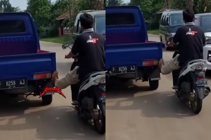 Dalam video tersebut terlihat pemotor Suzuki Address mendorong mobil pikap dengan modal kaki.