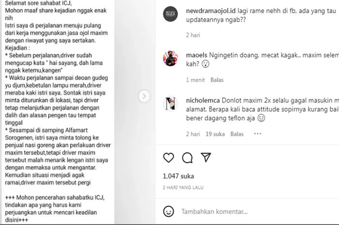Kemudian kabar tersebut diunggah ulang oleh akun Instagram @newdramaojol.id.