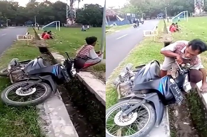 Gridmotor.id - Sebuah video memperlihatkan seorang pria terlalu fokus nonton bola sampai tidak sadar ada yang terjadi dengan motornya.