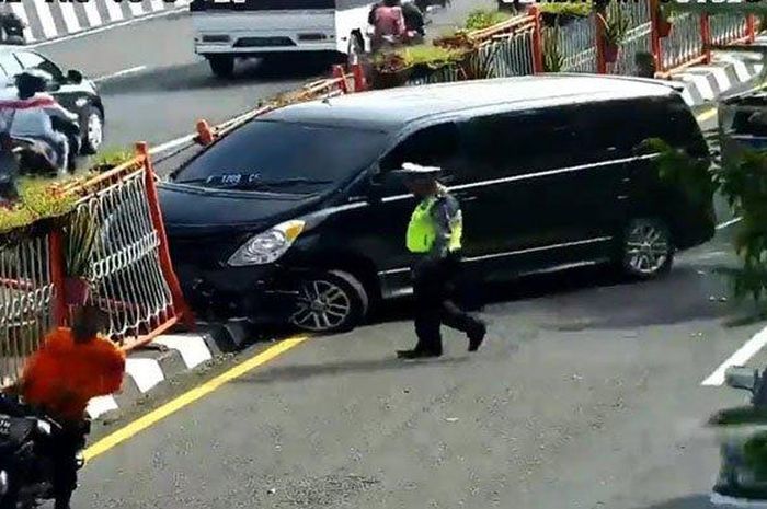 Honda BeAT cium pantat mobil Hyundai H1 yang hantam pagar jalan dikendarai pria berseragam polisi bikin heboh.