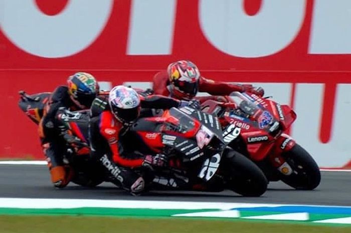 Jelang akhir MotoGP Belanda 2022 terjadi perebutan seru untuk podium ketiga antara Maverick Vinales (Aprilia) dan Jack Miller (Ducati).