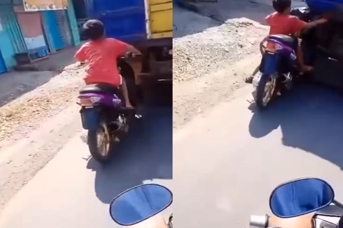 Gridmotor.id - Sebuah video memperlihatkan seorang bocah kecil alias bocil bawa motor Yamaha Mio Knalpot brong, endingnya cium pantat truk sampai oleng.