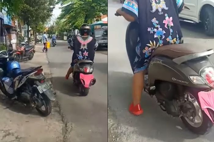 Dalam video tersebut, terlihat seorang emak-emak yang sedang naik motor Honda Scoopy dengan pelat nomor ditutupi celana dalam berwarna pink di Lamongan, Jawa Timur.