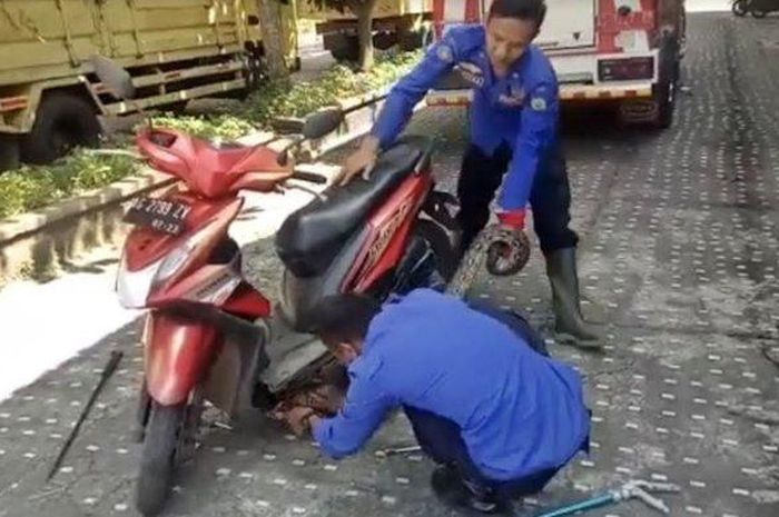 Karena ukuran ular cukup besar, petugas evakuasi sampai harus membongkar dasboard bagian bawah motor untuk mengeluarkan hewan melata tersebut.