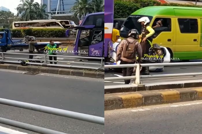 2 motor moge polisi itu momentum nyangkut di Tol Dalam Kota sempat direkam oleh warga sekitar.