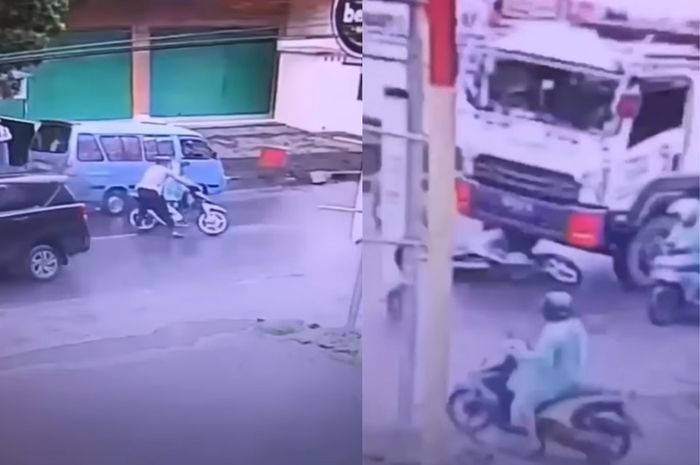 Bahkan pemotor tersebut sampai terpeleset bersama dengan motornya hingga masuk kolong truk.