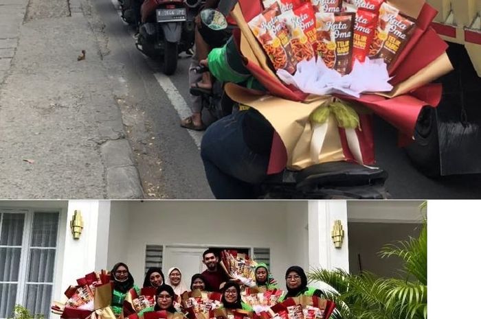 Ternyata, Raje juga memberikan kejutan kepada para kurir ojol wanita dengan memberikan buket Telur Gabus Kata Oma.