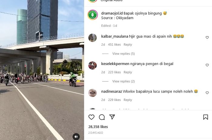 Lalu rombongan moge menyalip ojol tersebut dengan santainya. Sang ojol hanya bisa celingak-celinguk di jalan.
