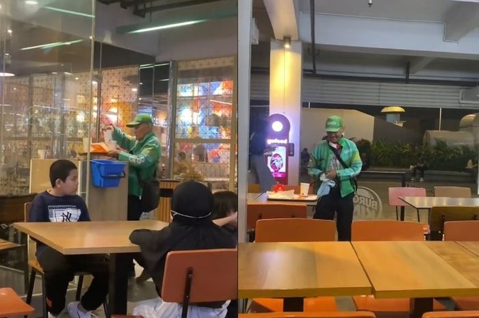 Melihat hal ini kakek yang berprofesi sebagai ojol ini membantu membereskan sisa makanan dan membuangnya ke tong sampah.