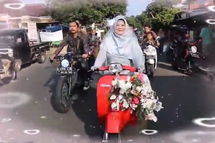 Gridmotor.id - Emak-emak keren ini antar anaknya ke pelaminan naik vespa di Majalengka.