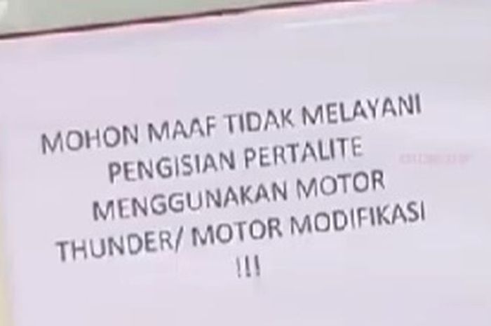 Jadi pengelola SPBU itu memberikan peringatan kalau pegawainya tidak akan melayani pengisian Pertalite khusus untuk Suzuki Thunder maupun motor yang sudah dimodifikasi.