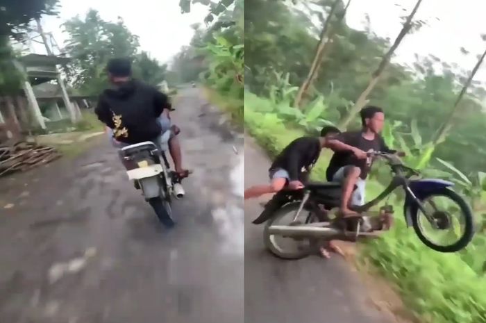 Dalam video tersebut terlihat dua orang pria tampak menaiki motor Honda Supra jadul.