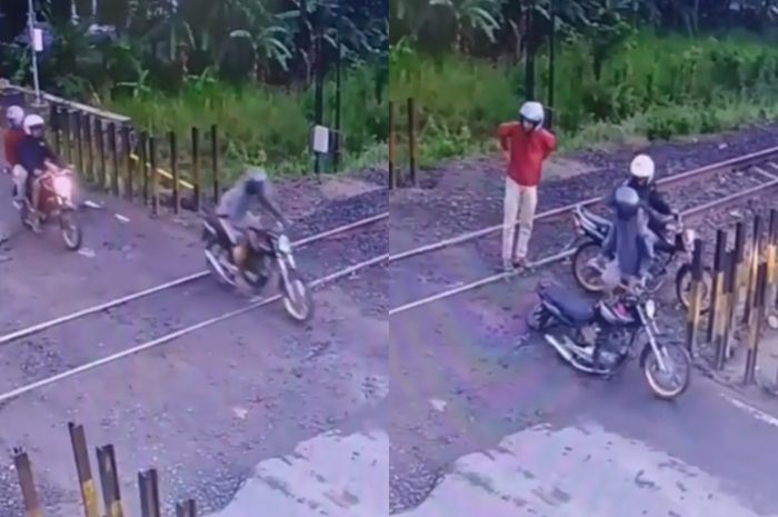 Gridmotor.id - Sebuah video memperlihatkan pemotor Honda Mega Pro ketiban apes setelah melewati pelintasan kereta api.