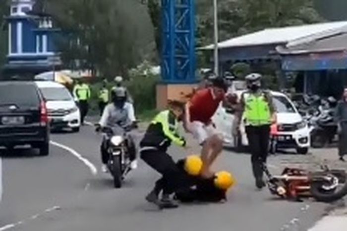 Gridmotor.id - Bikers KLX yang menghindari razia polisi hingga terjatuh lalu ditendang oleh pemilik Honda Brio, berakhir damai.