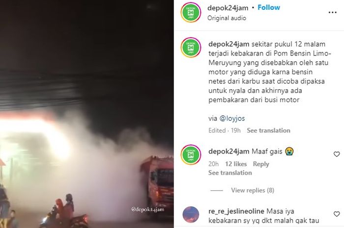 "Kebakaran di pom bensin Limo-Meruyung, yang disebabkan oleh satu motor yang diduga karena bensin menetes dari karbu. Saat dicoba dipaksakan untuk nyala, akhirnya ada pembakaran dari busi motor," demikian tertulis dalam kolom keterangan kiriman video tersebut.