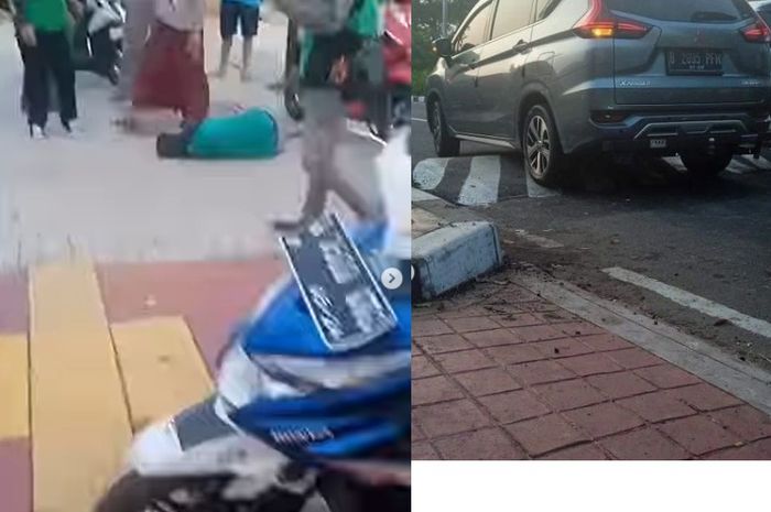 Akibat dari kecelakaan tersebut, pengendara sepeda motor mengenakan kaos berwarna biru jatuh terkapar tak sadarkan diri