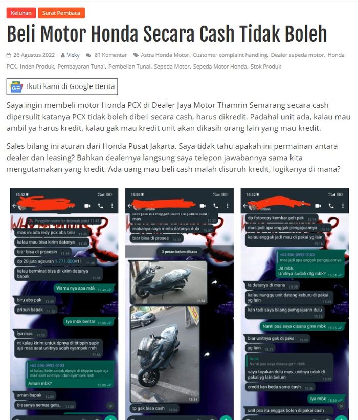 Dalam artikel tersebut mengatakan, transaksi itu dilakukan konsumen dengan sales di Dealer Jaya Motor Thamrin Semarang, Jawa Tengah.