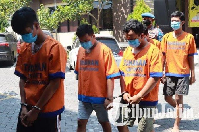Para tersangka adalah EA (22), DA (24), MR, DR, dan FB. Mereka warga Gedangan, Sidoarjo. Sementara satu pelaku yang buron diketahui berinisial I, warga Sedati, Sidoarjo.