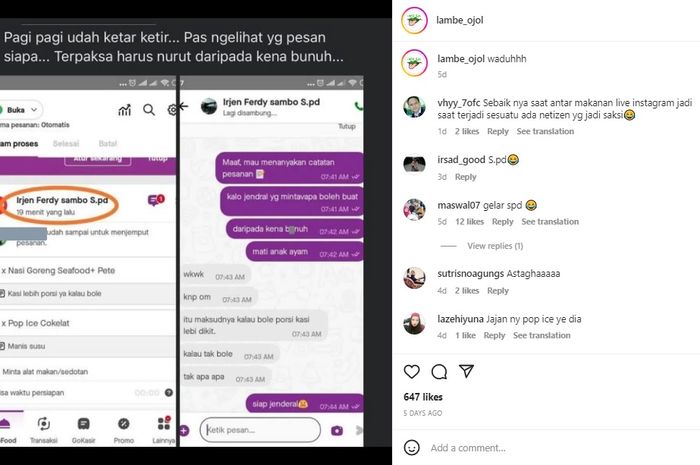 Dalam unggahan akun instagram @lambe_ojol pada Rabu (31/08/2022) menampilkan tangkapan layar aplikasi pemesanan makanan dengan nama customer Ferdy Sambo.