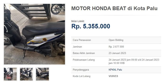 Nah, calon peminat cukup menyetorkan uang jaminan untuk ikut lelang motor matic Honda BeAT ini Rp 2,6 jutaan.