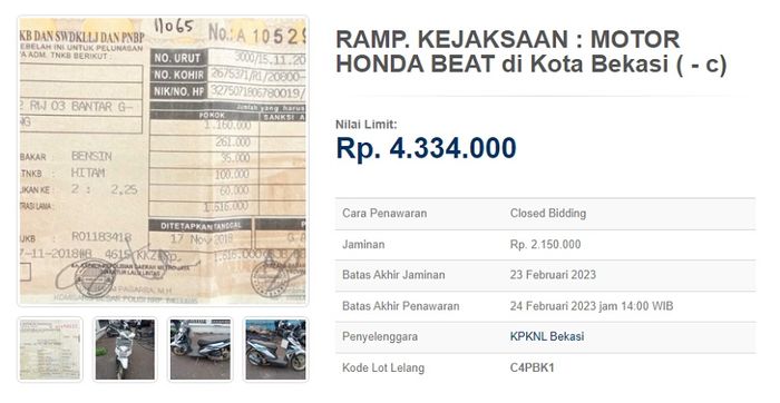 Selain itu sebelum menawar motor matic Honda BeAT ini, peserta lelang harus menyetorkan uang jaminan Rp 2.150.000.