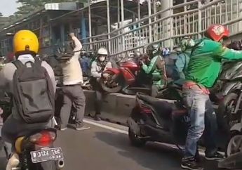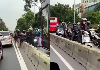 6 Tahun yang lalu - Para pengendara motor tersebut beramai-ramai mengangkat motor melewati pembatas beton di jalur Transjakarta.