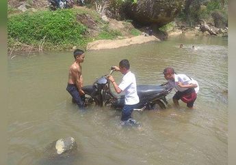 5 Tahun yang lalu - Demi ujian akhir, pelajar dan guru mendorong motor menyebrangi sungai Ciupih karena jembatan penghubung yang rusak.