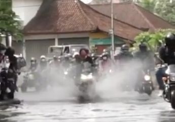 The Power Of Emak-emak Libas Genangan Air Bikin Konvoi Motor Minggir