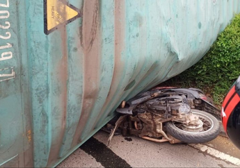 6 Tahun yang lalu - Seorang pemotor terlibat kecelakaan dengan truk kontainer, yang membuat tubuh sang pemotor tersangkut di antara ban belakang truk.