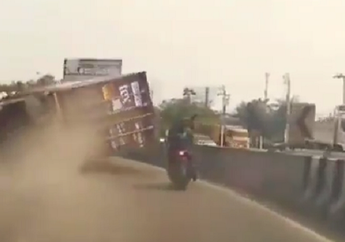5 Tahun yang lalu - Sebuah truk yang memuat peti kemas terguling dan nyaris menimpa pengendara motor matic pada Kamis (21/10/2019).